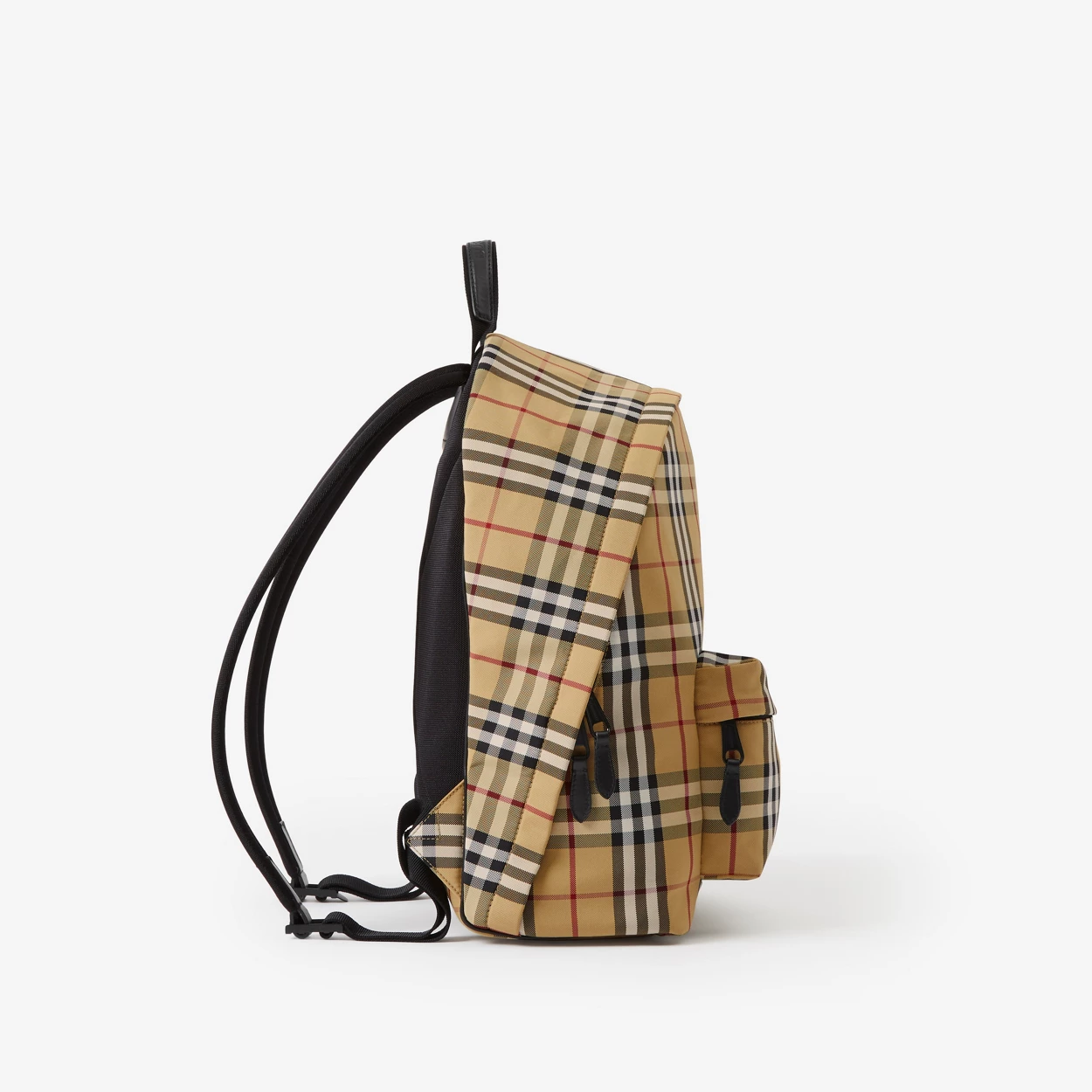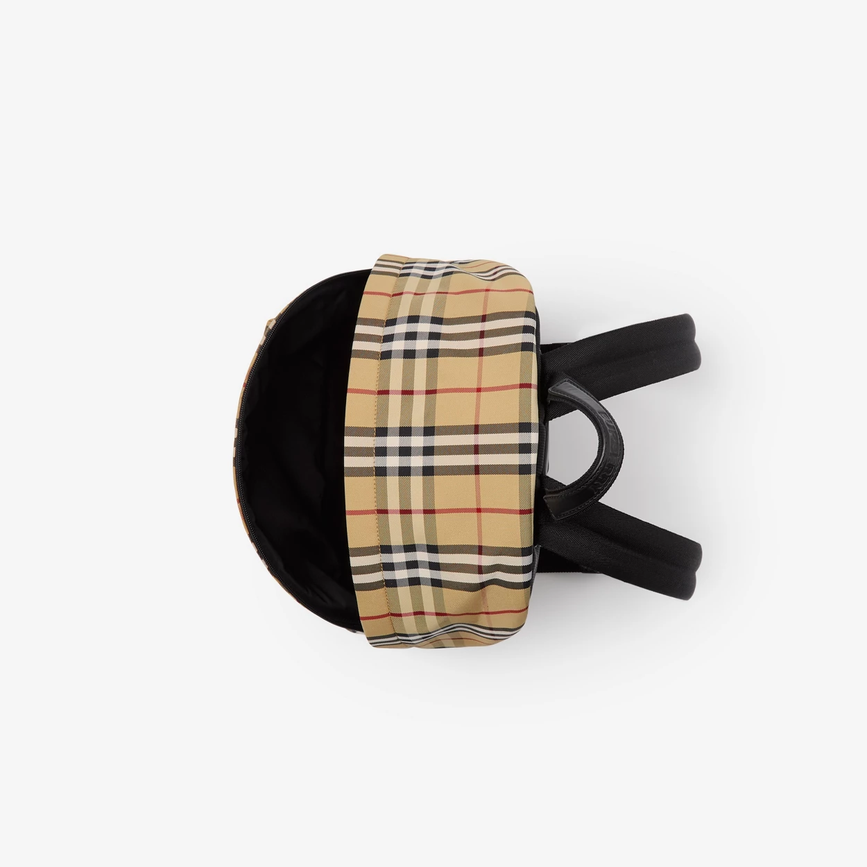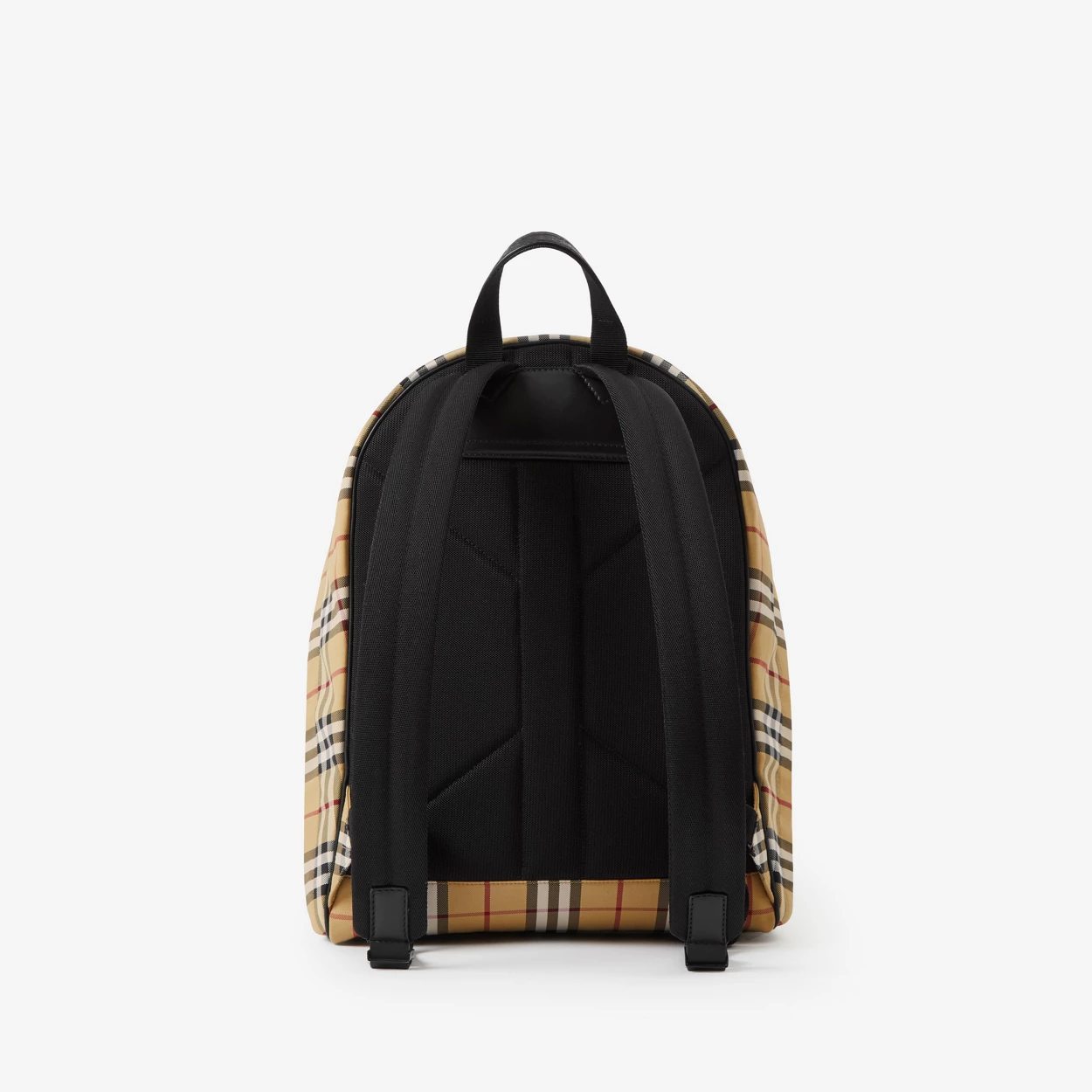 Nylon backpack in a fine Burberry check. Roomy nylon-lined interior with leather trim and quilted back panel for comfort.