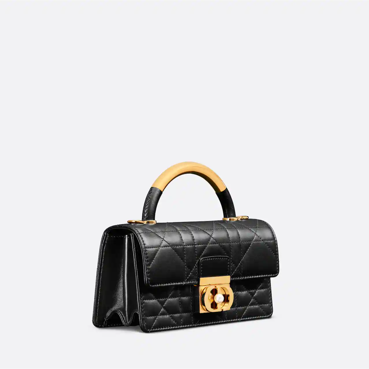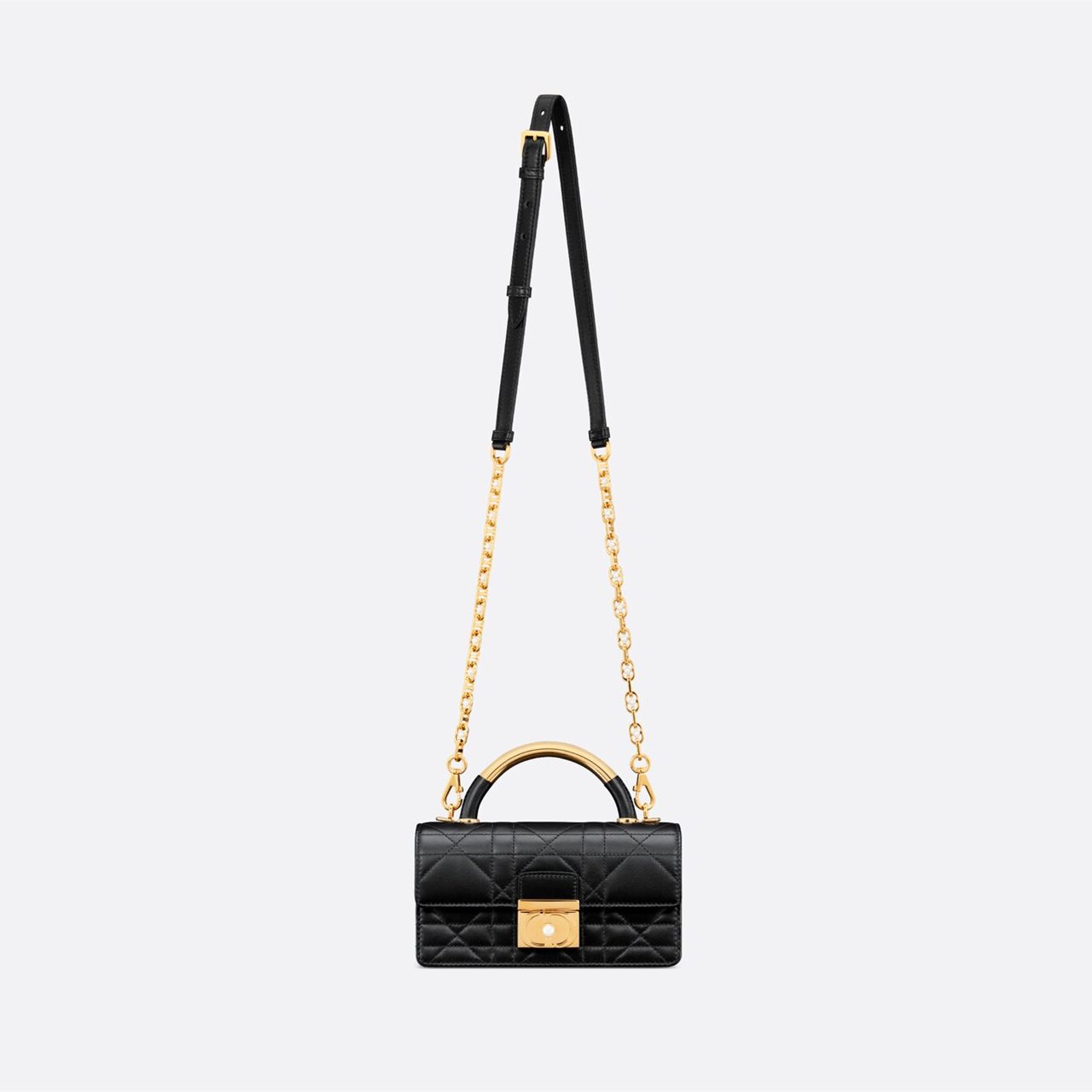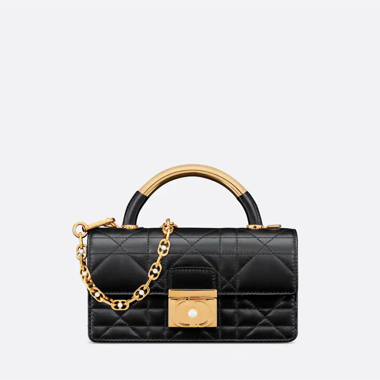 This Dior Ange handbag is a new product in the Fall 2024 ready-to-wear collection, opening Dior's new series with an elegant and fashionable aesthetic style. Crafted from black cowhide leather, it is decorated with oversized cannage stitching, and the stiff antique gold-finished metal top handle is engraved with the Christian Dior Paris logo. The flap is decorated with a CD buckle embellished with resin beads, which is unique in design. The silhouette with triangular gussets is matched with two spacious compartments and a slip pocket to store various daily necessities. Mini style, elegant design, adjustable and detachable chain shoulder strap composed of gold-finished metal CD chain rings embellished with resin beads, can be carried by hand, shoulder or crossbody.