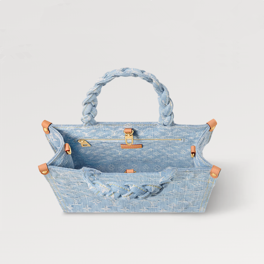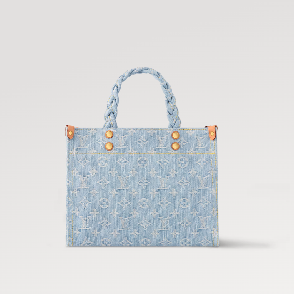 Based on the OnTheGo bag, the Let Go small tote bag conveys a summery vibe with its Monogram Denim washed tones and braided handles, paired with cowhide rivet corners. The soft shape allows for comfortable carrying and can accommodate a wallet and phone.
