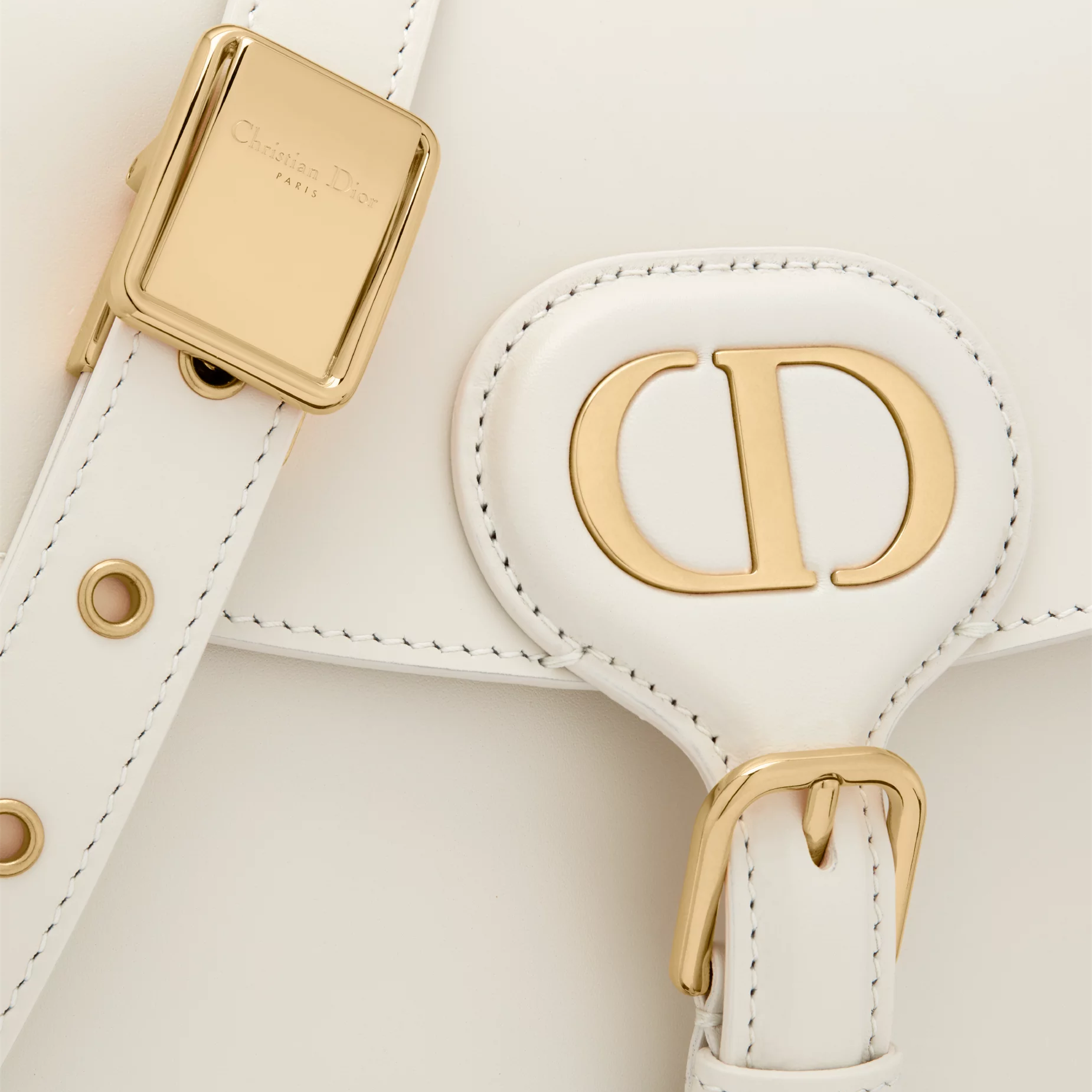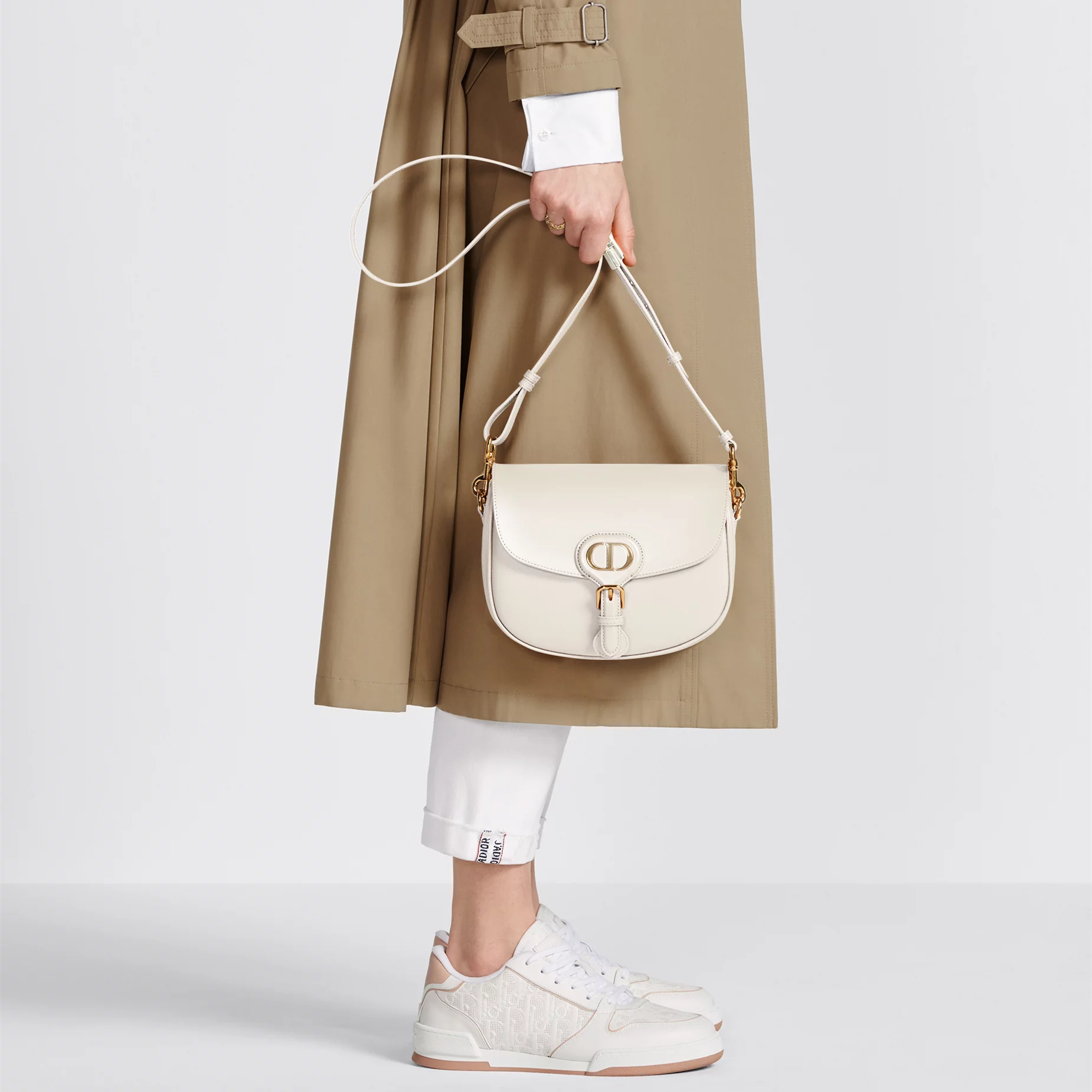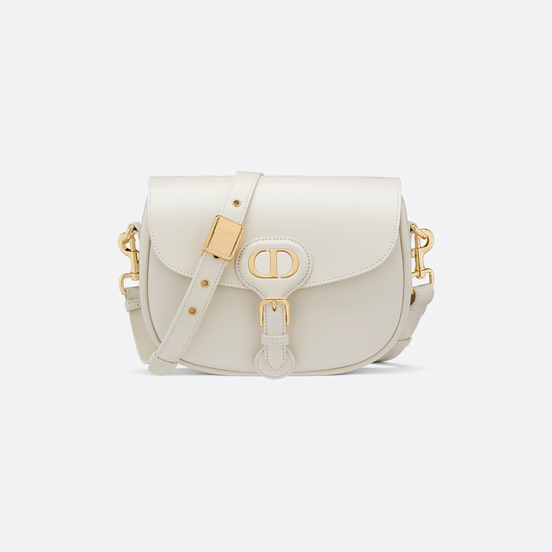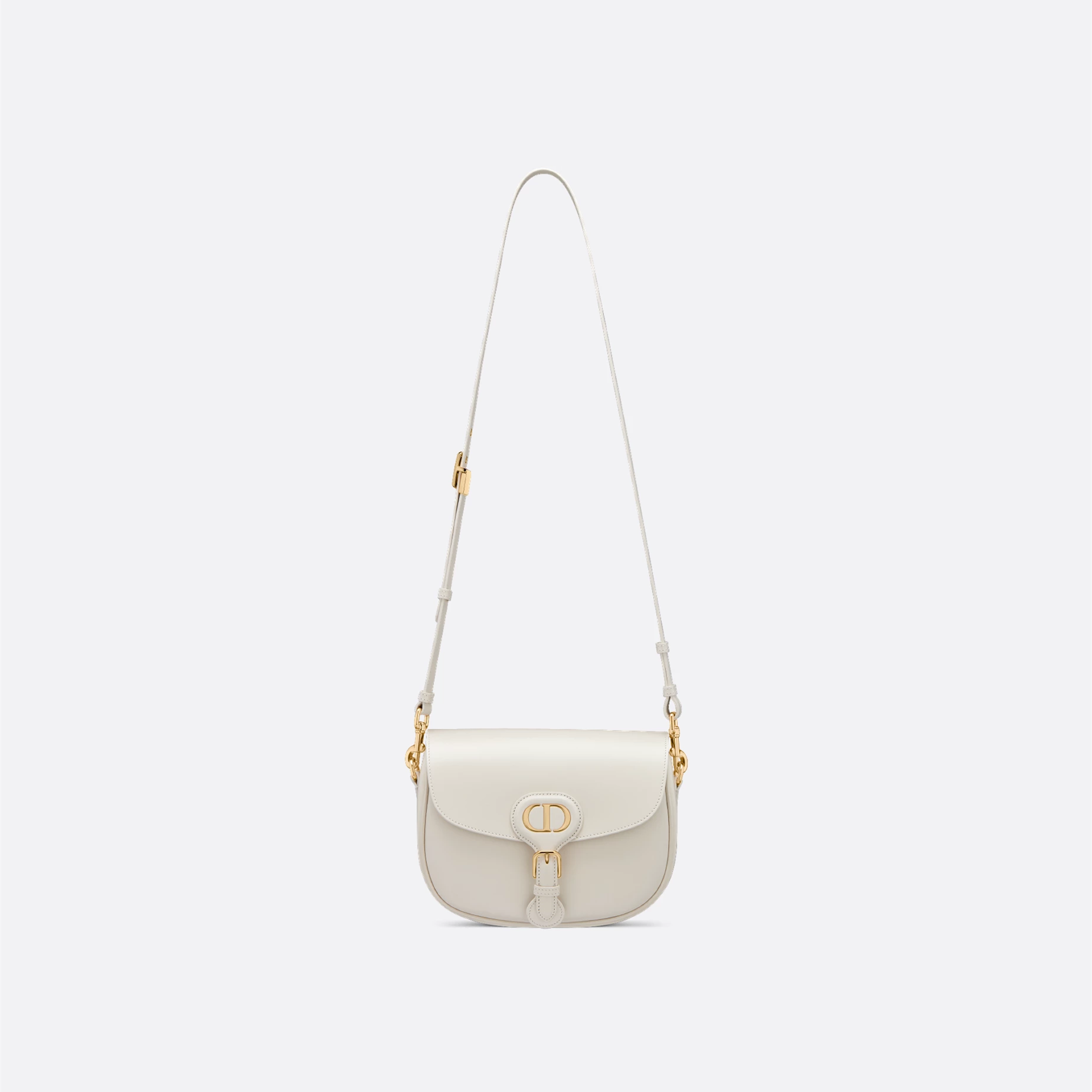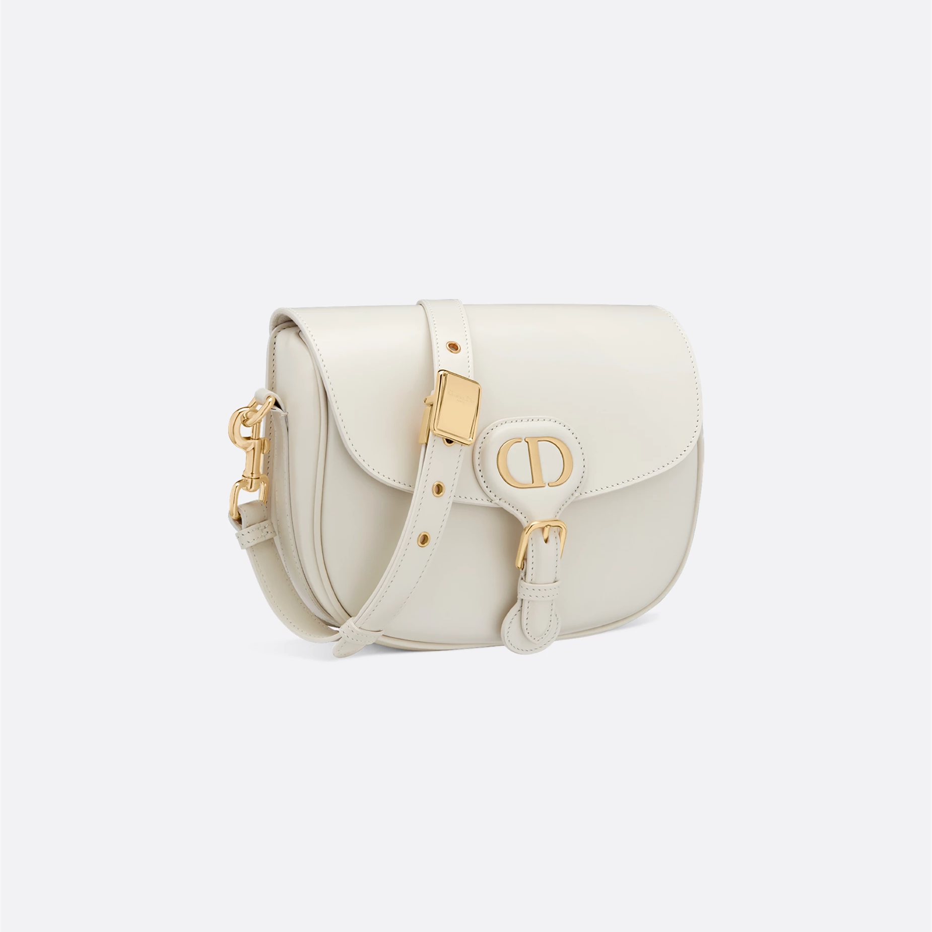 TThis Dior Bobby bag is a shoulder bag with an elegant silhouette and harmonious proportions. Crafted in creamy white glossy calfskin leather, it is enhanced with antique gold-finished hardware. The interior is made of suede calfskin leather, which is soft and textured. The medium model comes with a removable and adjustable sliding shoulder strap with military-style buckle, which can be carried by hand, on the shoulder or crossbody.