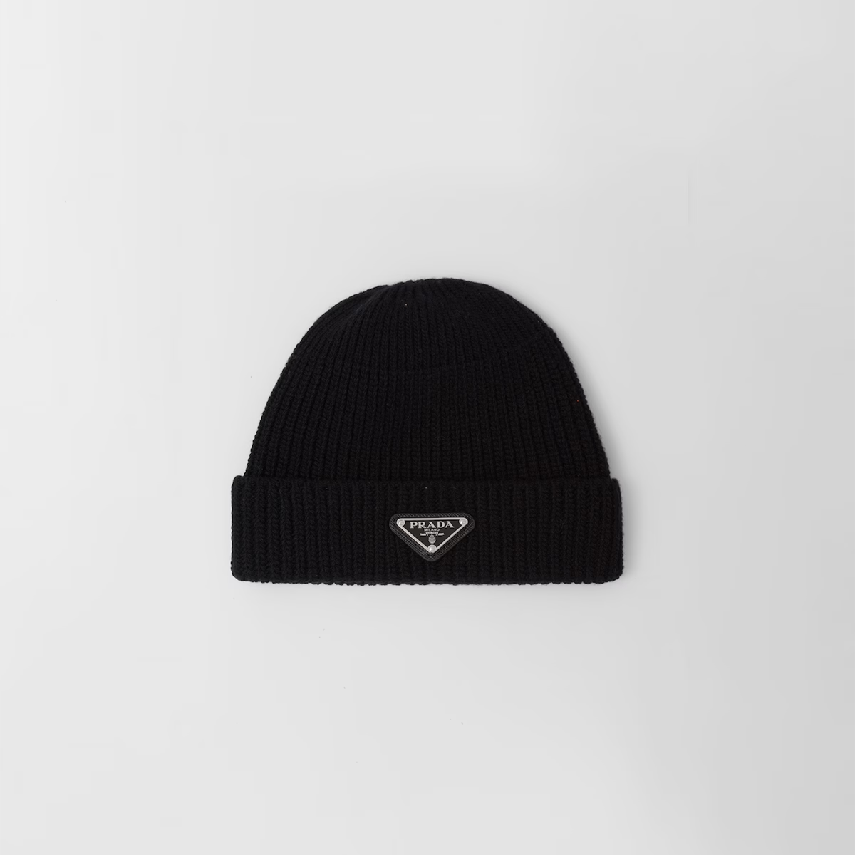 Worsted wool and cashmere create an elegant and modern beanie. The iconic enameled metal triangle logo is embellished on the leather triangle patch for a striking look.