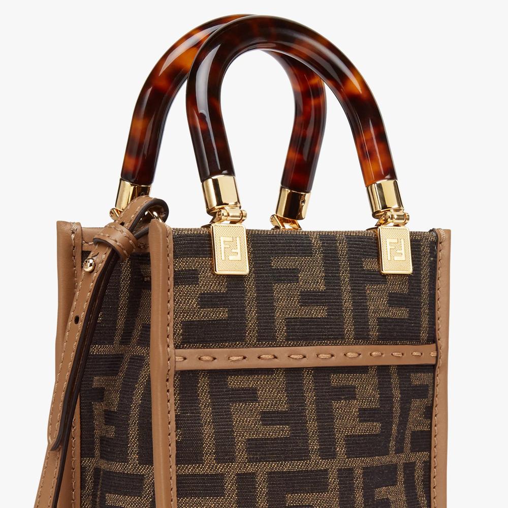 Sunshine Brown FF Jacquard Pattern Fabric Mini Tote Bag with Hard Perspex Tortoise Shell Effect Handle. Equipped with lined interior compartments, embellished with tonal leather trim and gold metal parts. With two handles and adjustable and detachable thin shoulder straps, it can be carried by hand or on the shoulder.