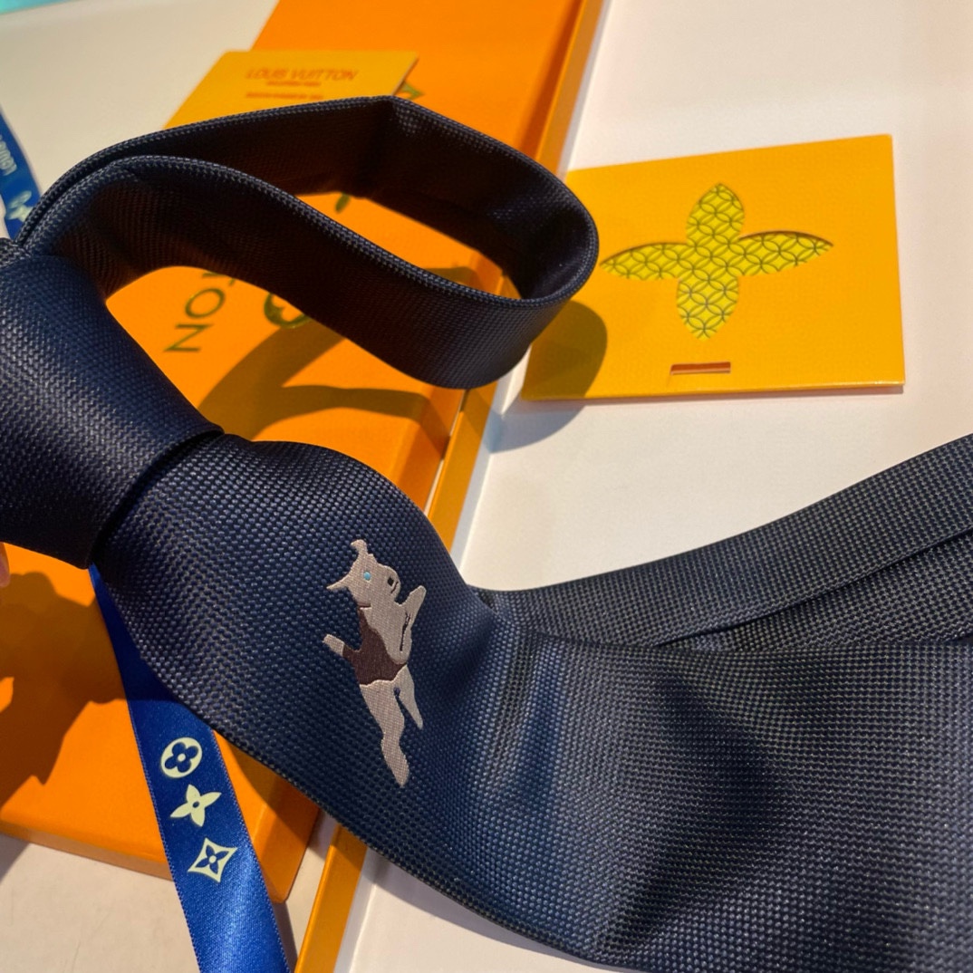 This unique Louis Vuitton Jumping Dog tie is a playful creation from a collaboration with Tyler. Featuring the seasonal mascot and an elegant Louis Vuitton logo at the base, this tie blends humor with the refined aesthetic of the golf-inspired series. Perfect for adding a touch of charm to formal or casual outfits.