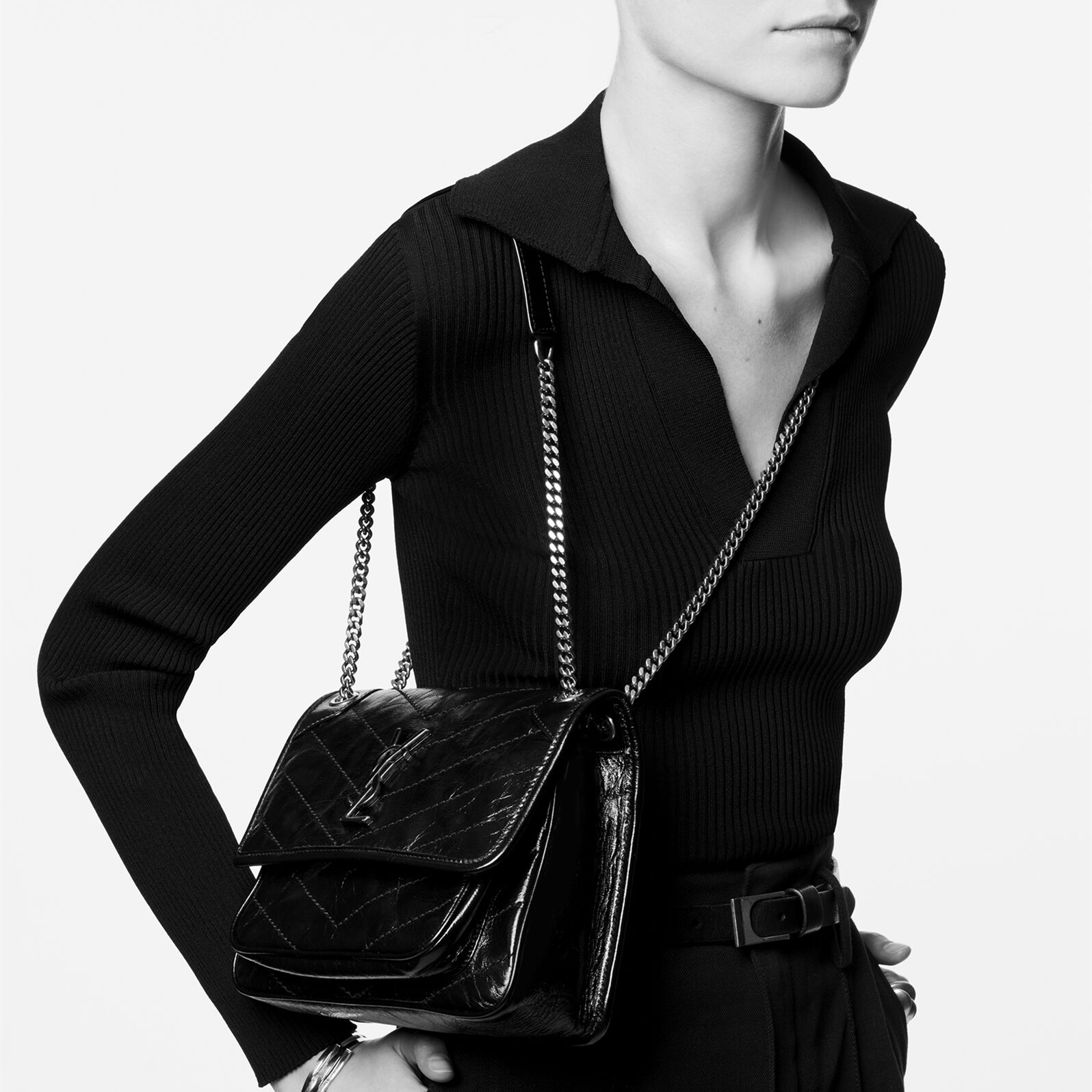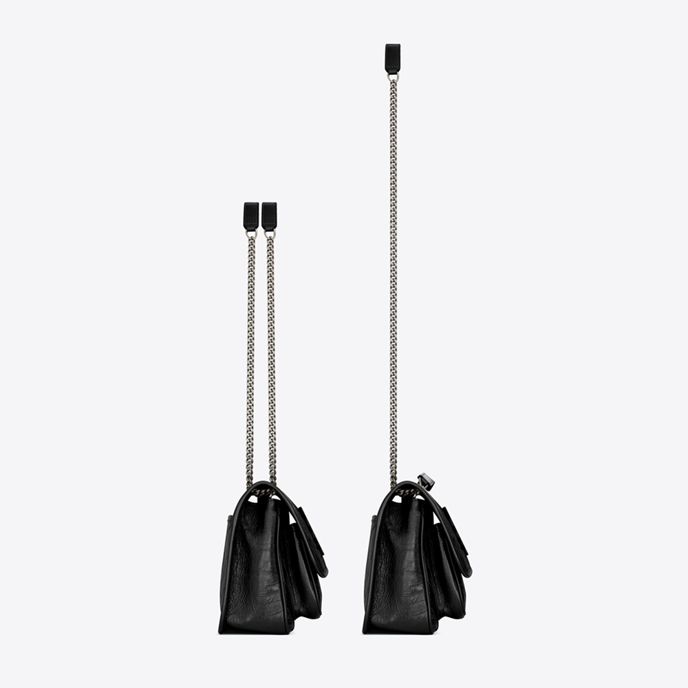 Carry it on the shoulder or crossbody with a sliding chain shoulder strap.