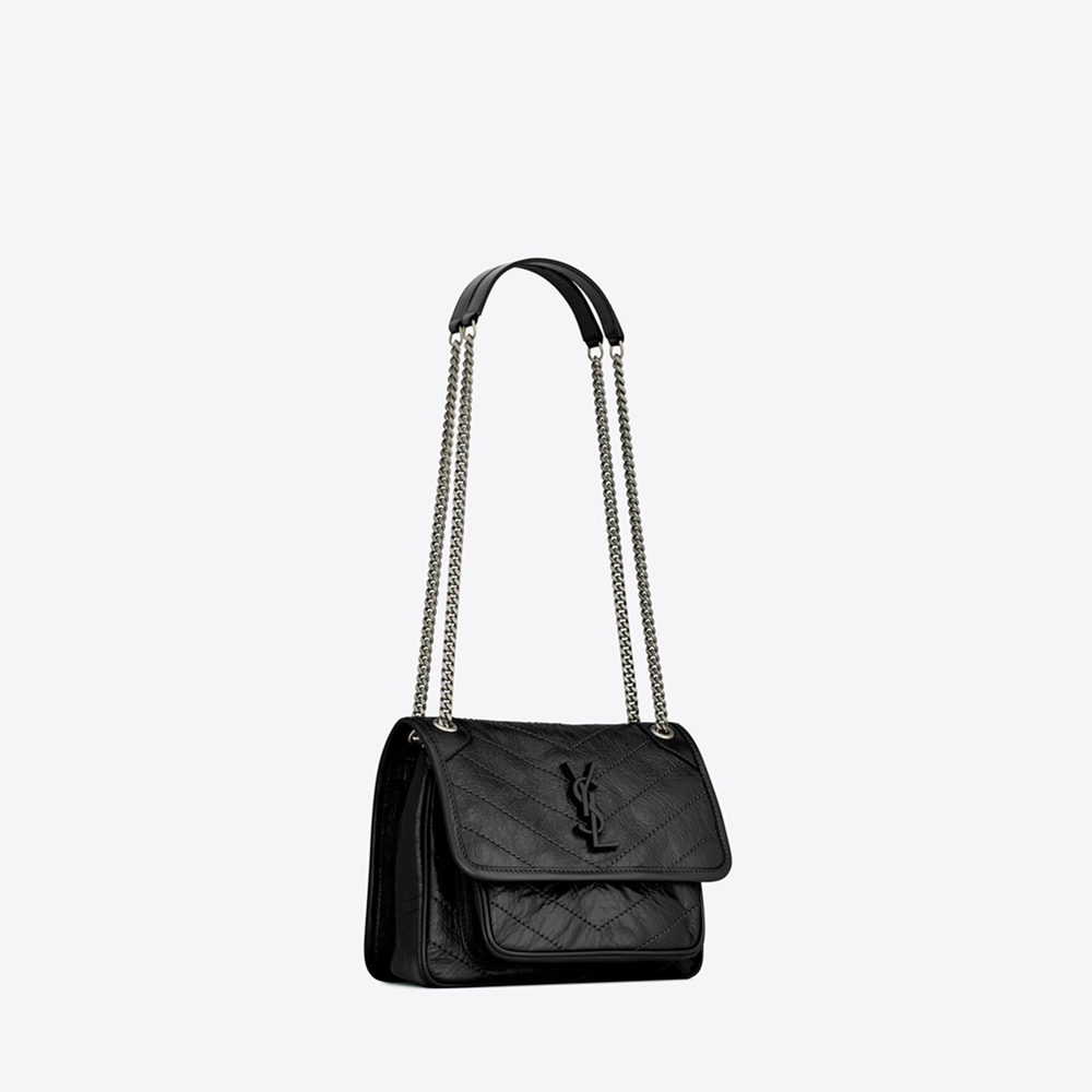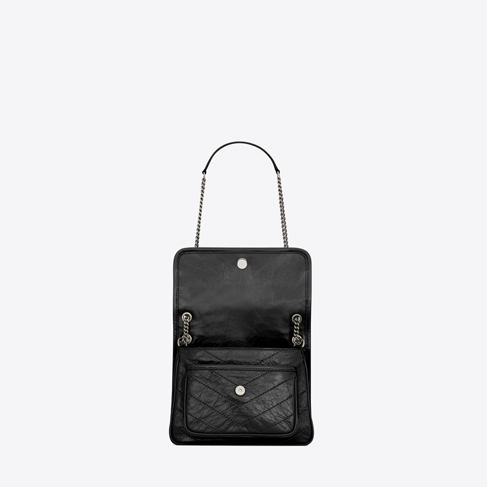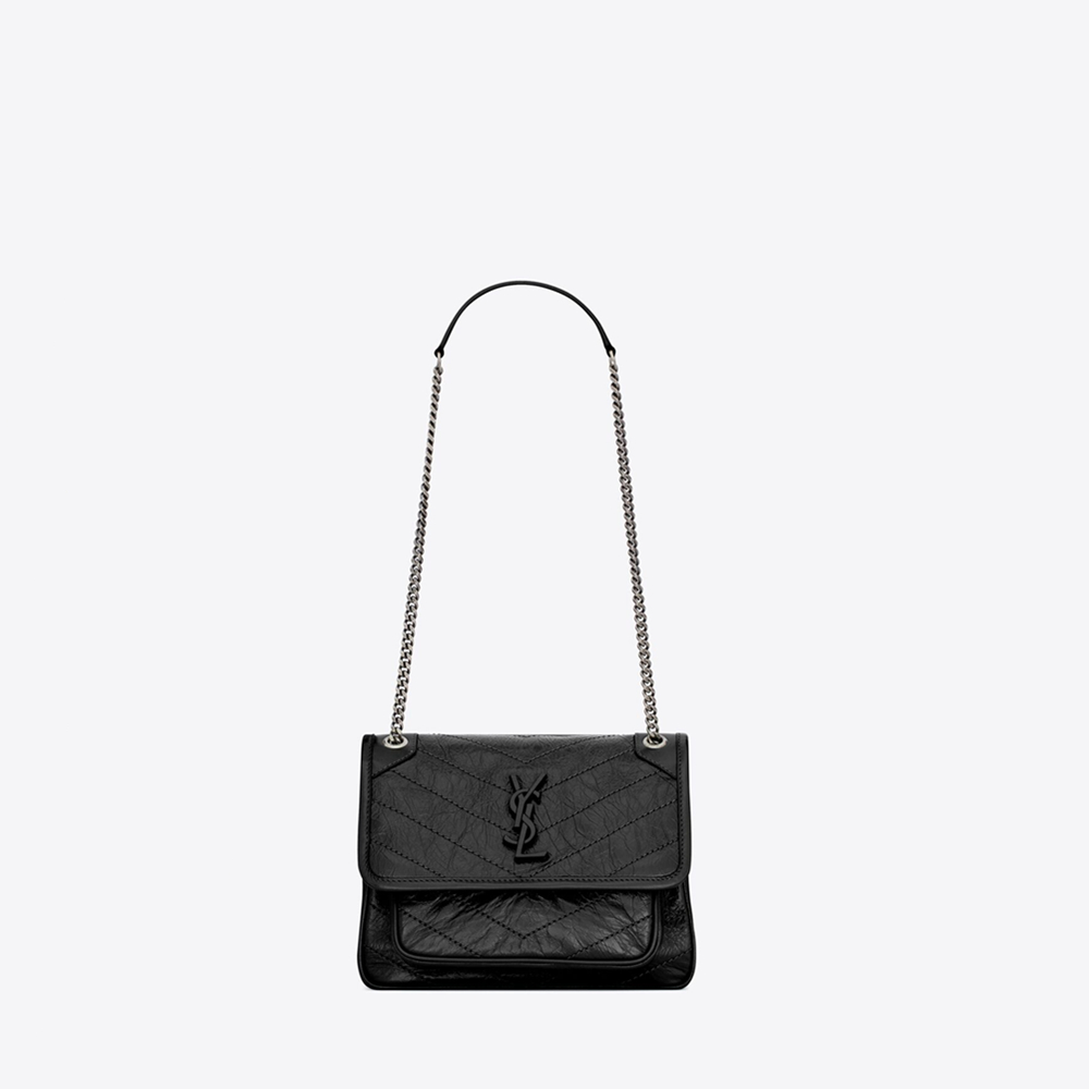 Vintage calfskin flap bag with V-shaped topstitching and the classic YSL signature encased in leather.
